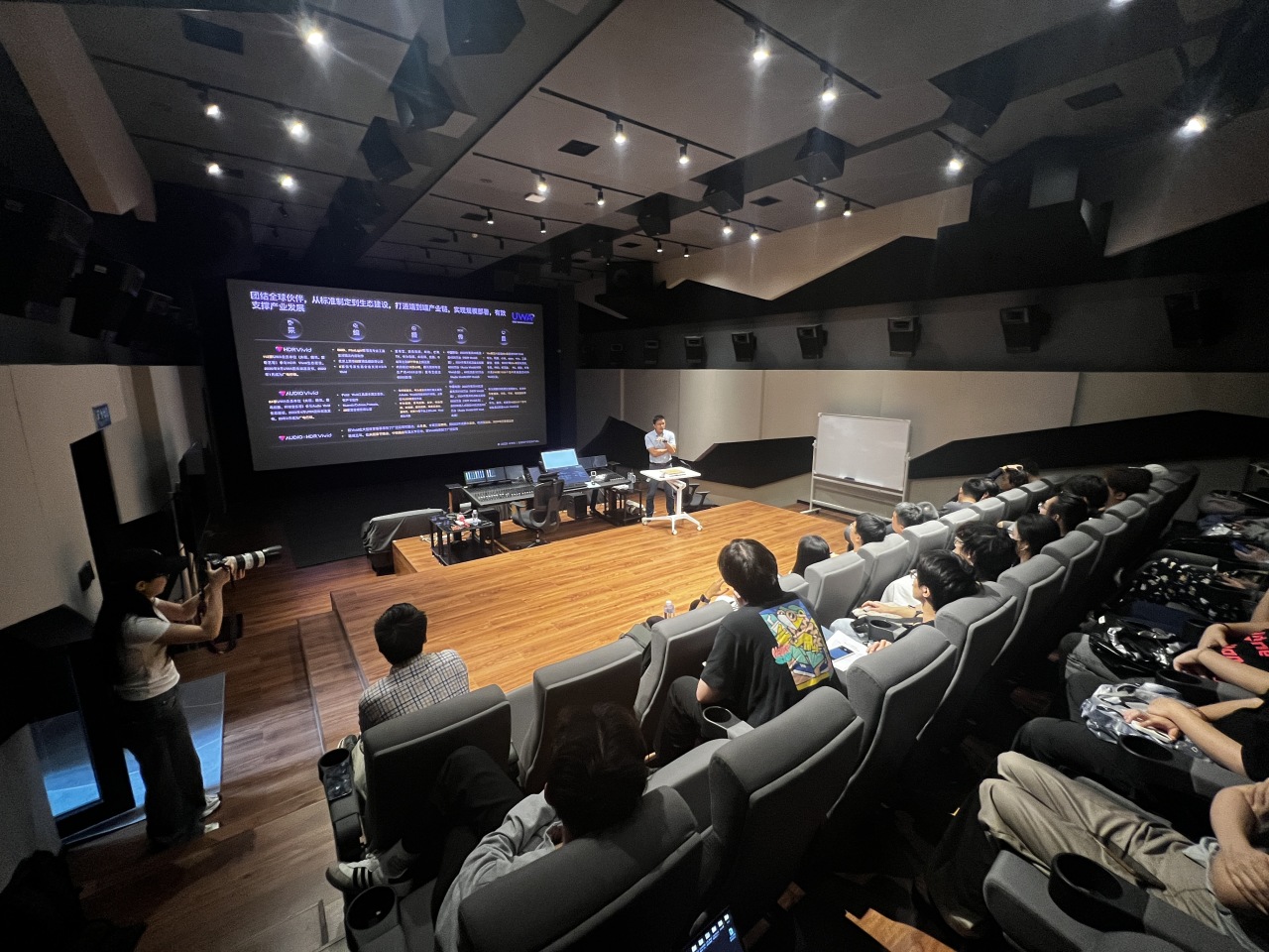UWA培训推广总监罗超以“菁彩声Audio Vivid生态、核心技术及制作工具”为核心,带来干货满满的分享。他不仅详细演示了广电领域端到端的“4K+双Vivid”超高清直播全链路方案,还现场播放了采用Audio Vivid技术制作的《歌手2025》直播节目片段,让师生们直观感受三维声技术带来的沉浸式听觉震撼。